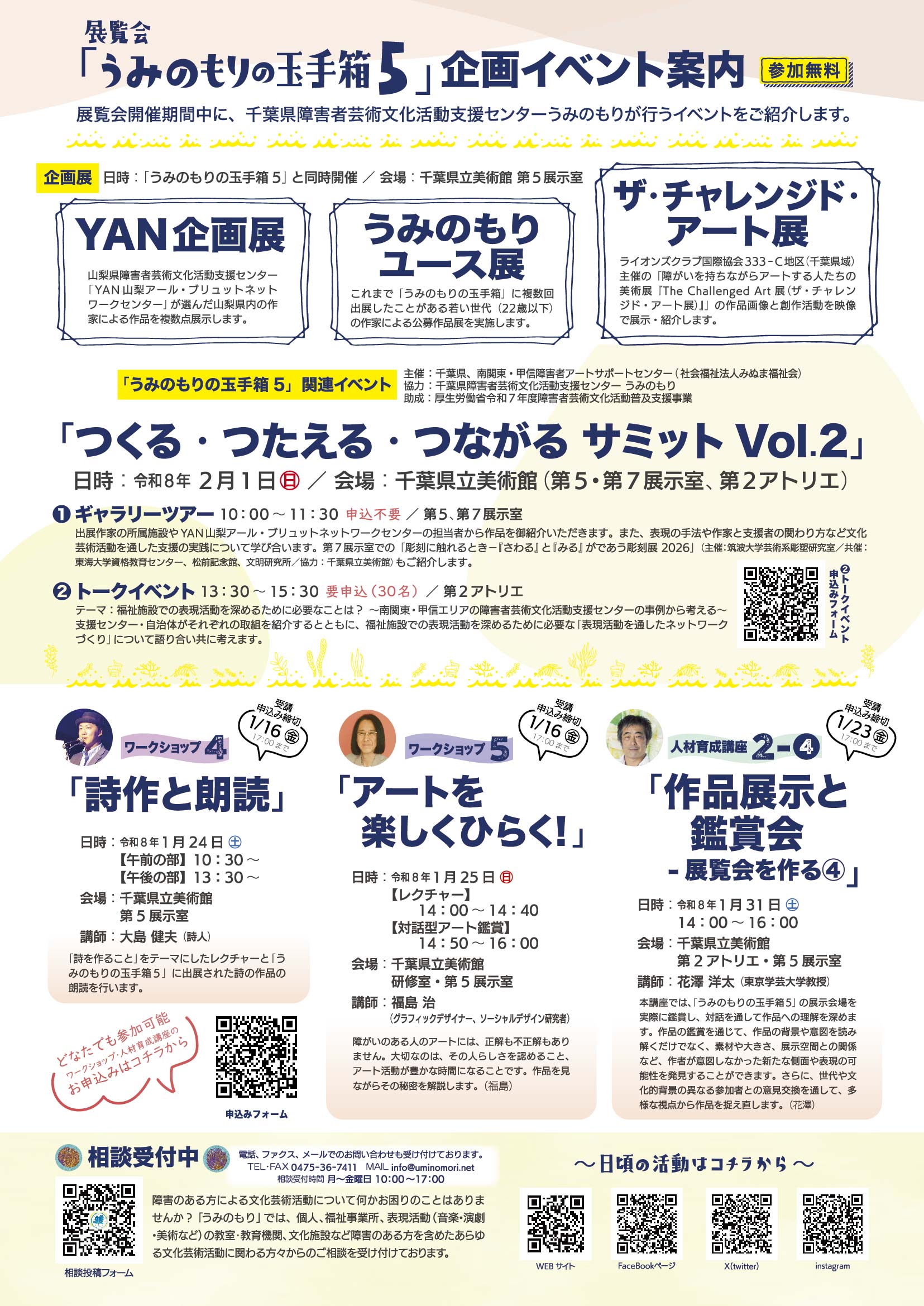 展覧会開催期間中に、千葉県障害者芸術文化活動支援センターうみのもりが行うイベントをご紹介します。